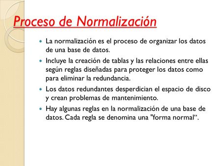 5. La normalización de bases de datos es un proceso que consiste en designar y aplicar una serie de reglas a las relaciones obtenidas tras el paso del modelo entidad-relación al modelo relacional.